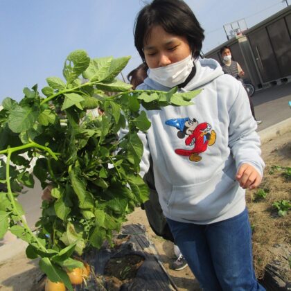 利用者さんと一緒にジャガイモの収穫をしました。 茎を持ち、引っ張ると土の中からジャガイモが出てきました。 土の中のジャガイモをみんな拾って楽しそうでした。...