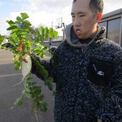 にじいろ畑の大根が大きく成長しました。 収穫を迎え、利用者さんと一緒に大根の収穫に向かいます。 「うんしょ、よいしょ」土の中深くに埋まっているため、なかな...