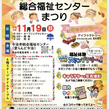 11月19日(日)今治市総合福祉センター祭りに参加しました。 当日は、天気🌞も良く、沢山の方々にご来場いただきました。 1階の会場入り口前...