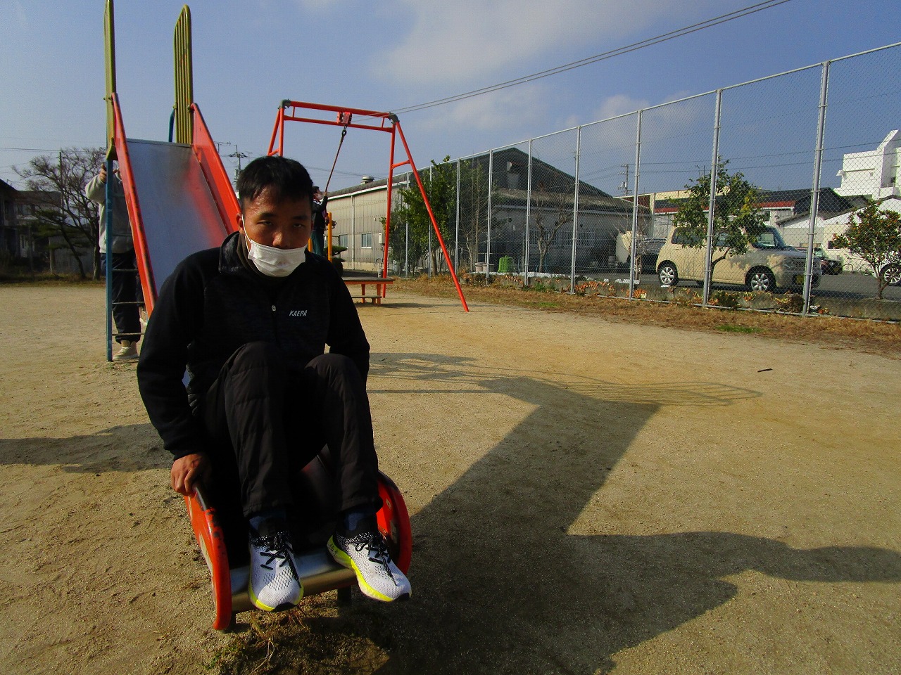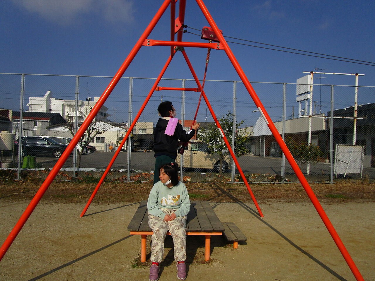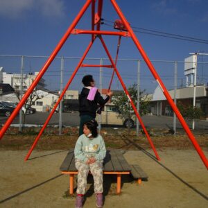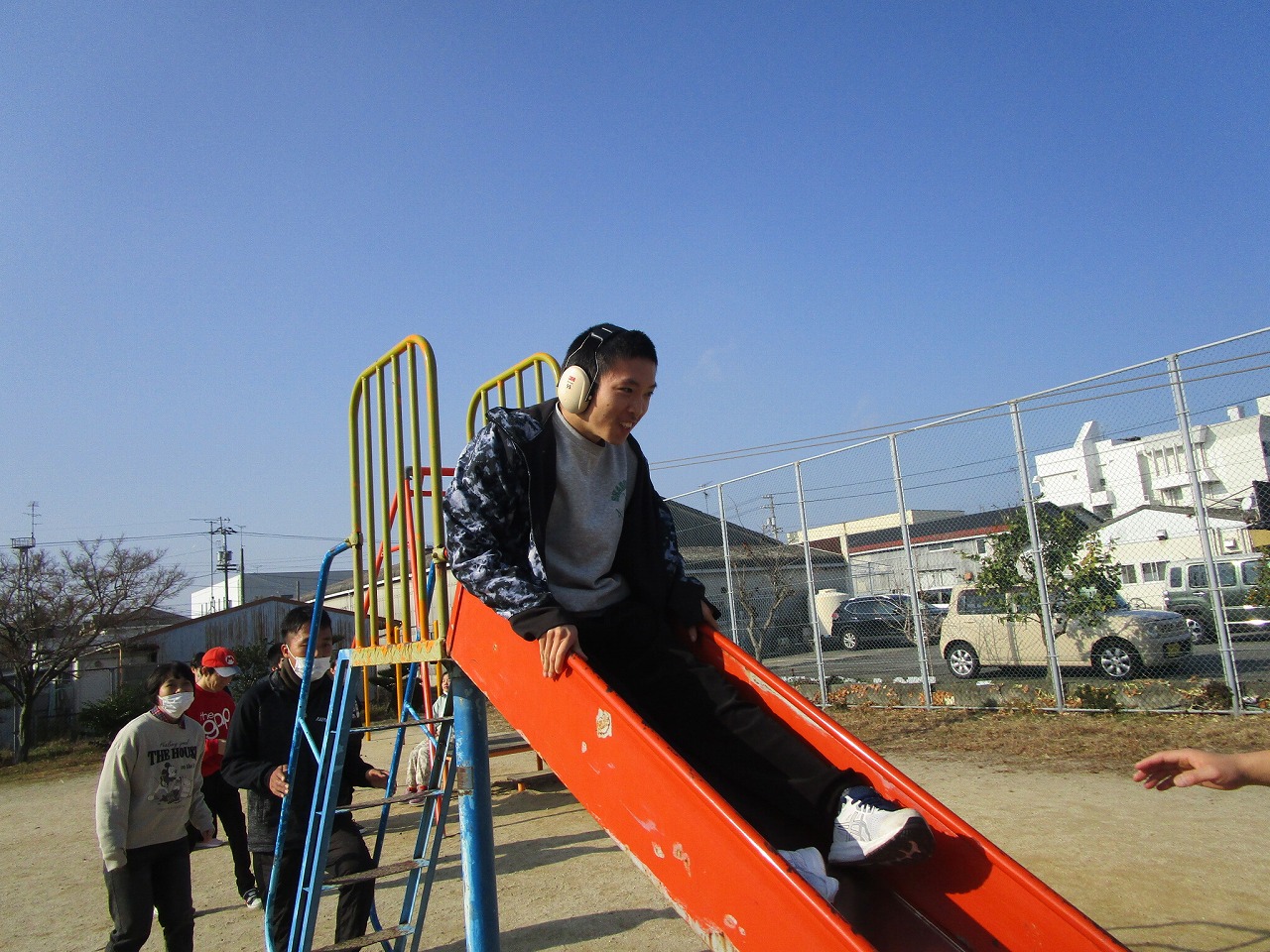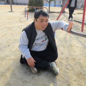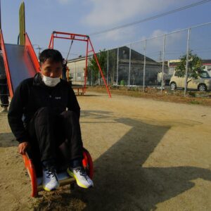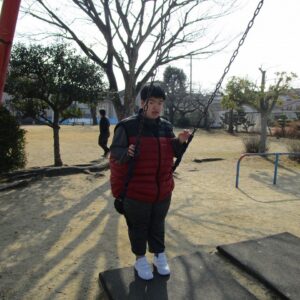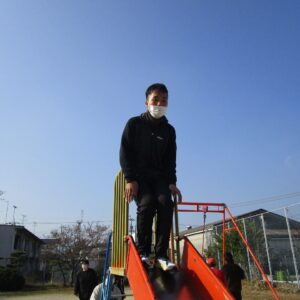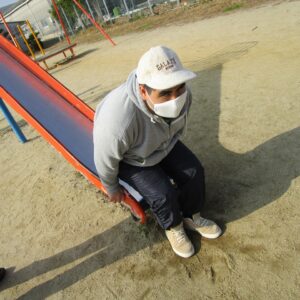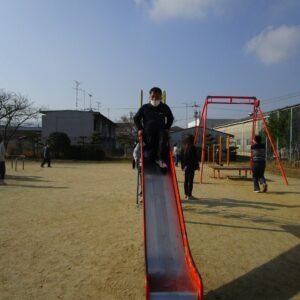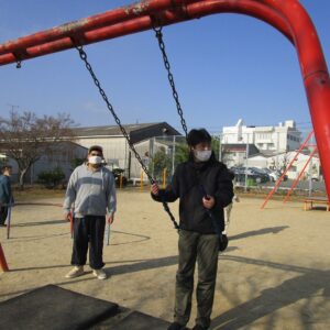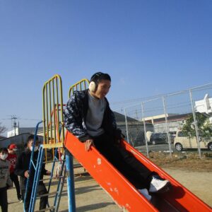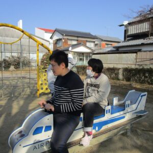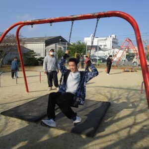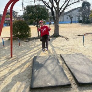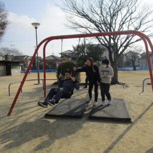 外遊びの時間が近づき、みんな用意をして車に乗り込みます。郷本町公園に到着後、それぞれ好きな遊具に向かい、