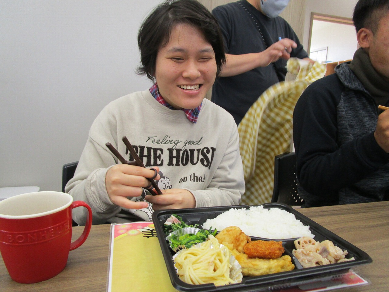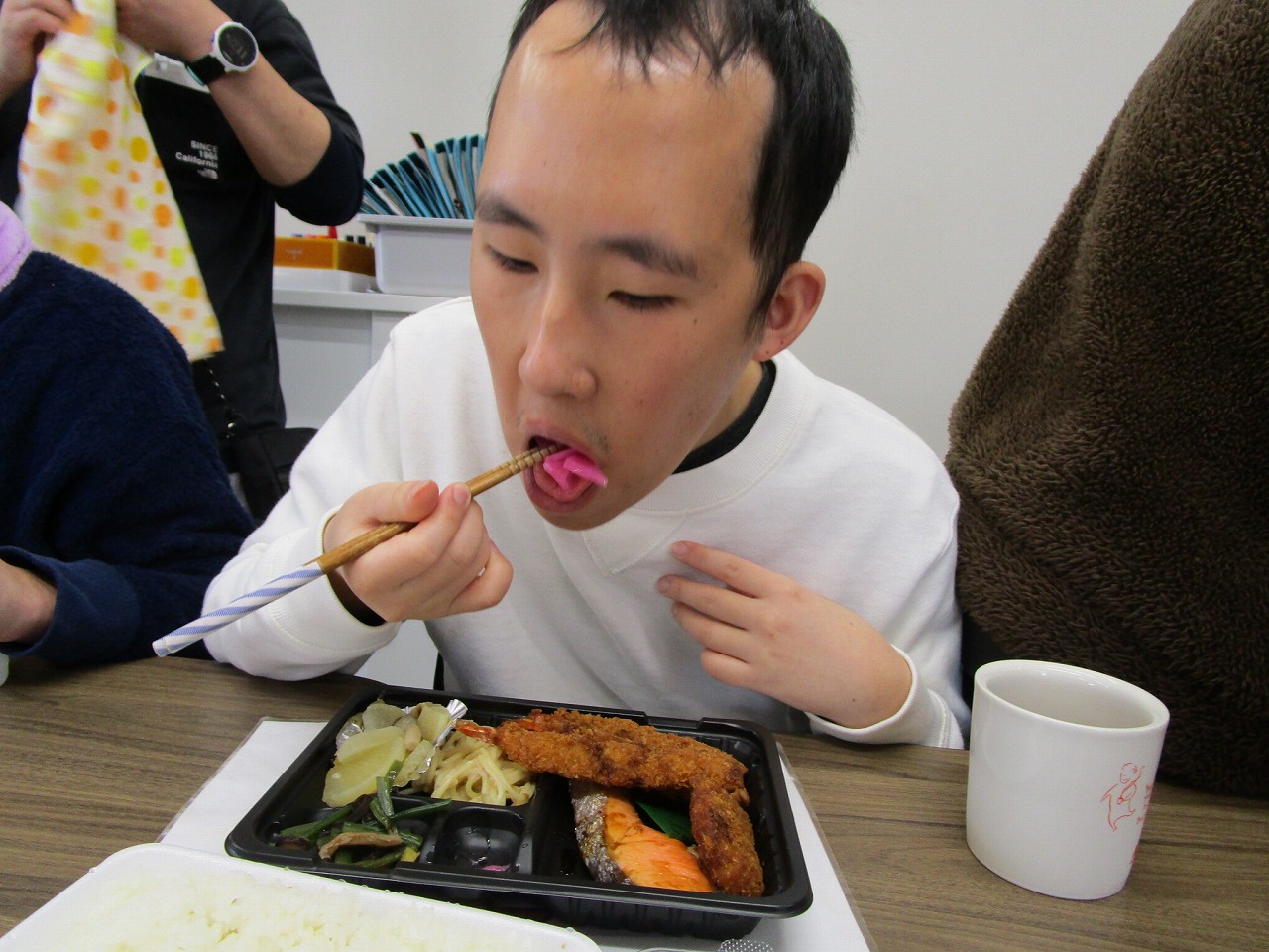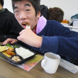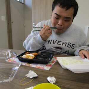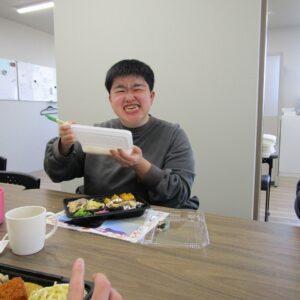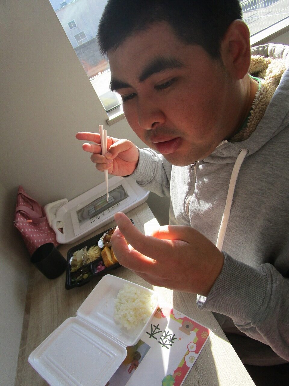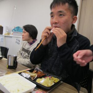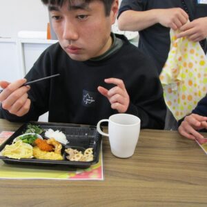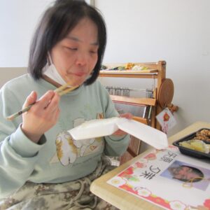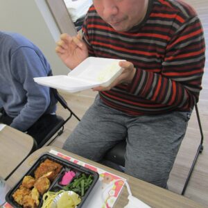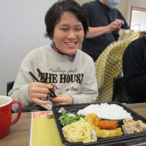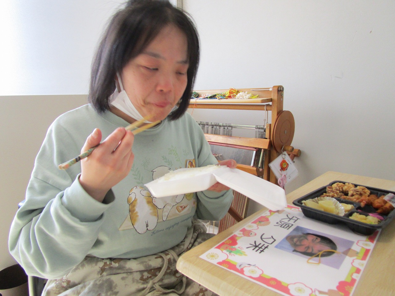 にじいろに戻り、富喜のお弁当「いただきます。」美味しそうに食べてる姿を見てるとこっちまで笑顔になります。