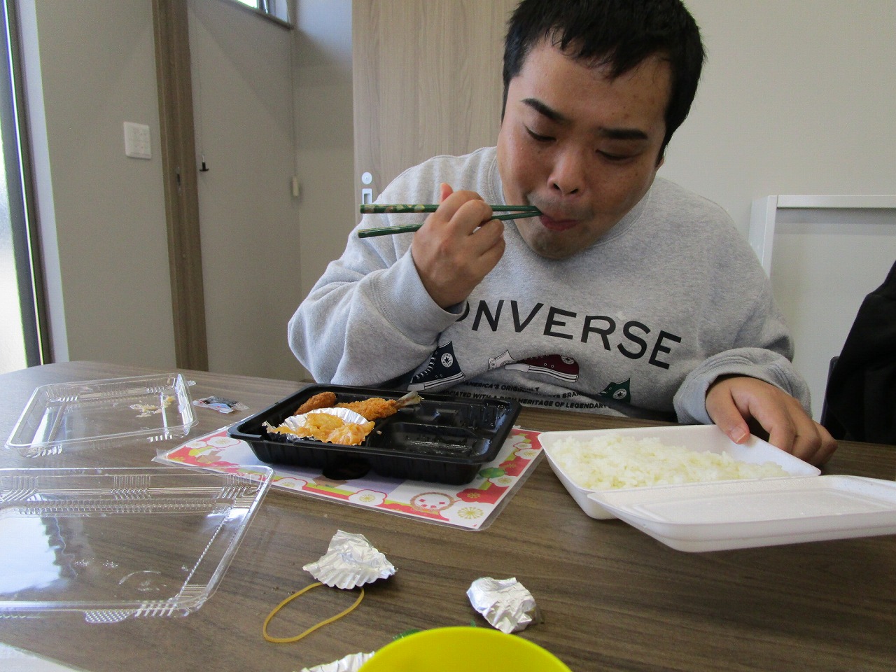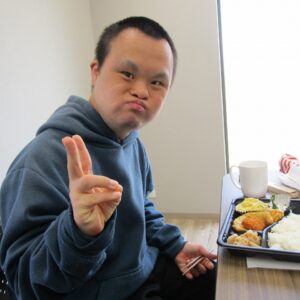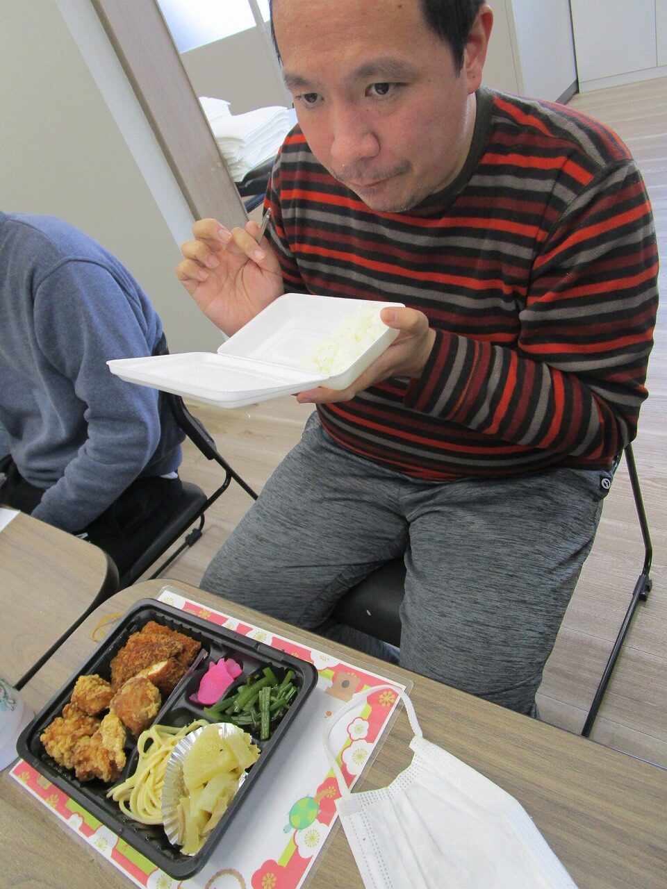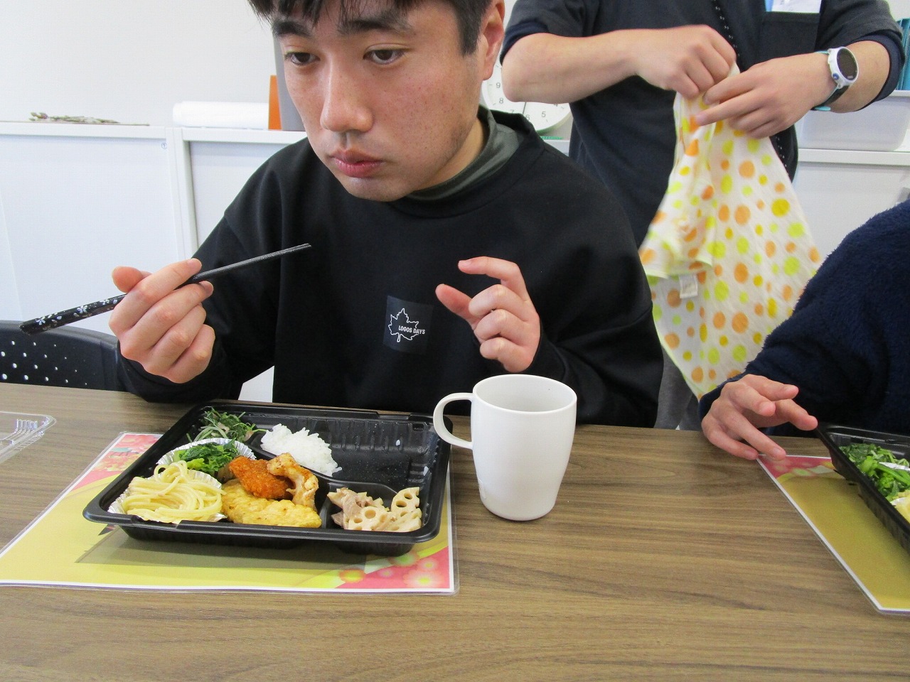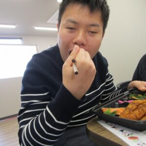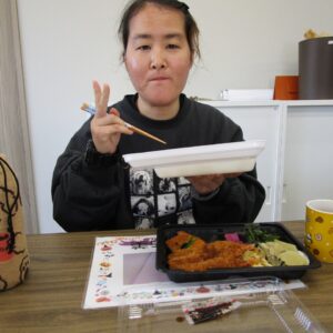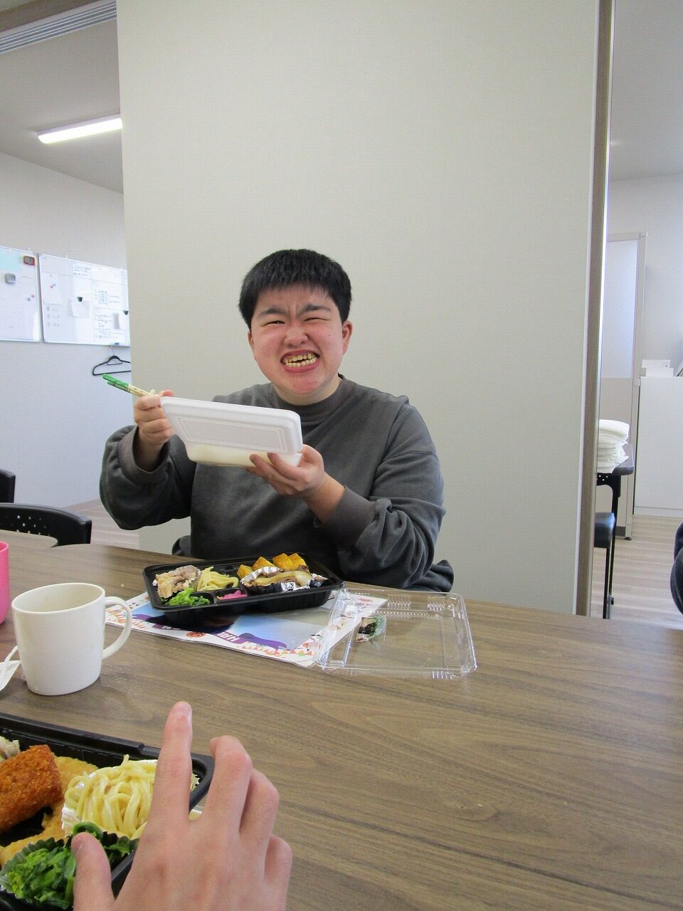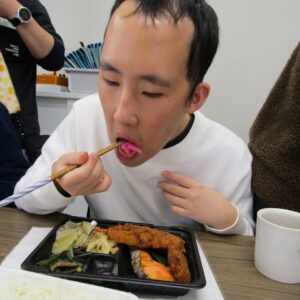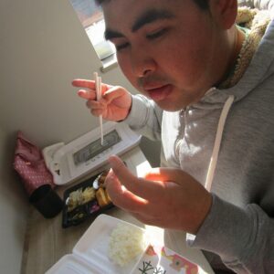 にじいろに戻り、富喜のお弁当「いただきます。」美味しそうに食べてる姿を見てるとこっちまで笑顔になります。
