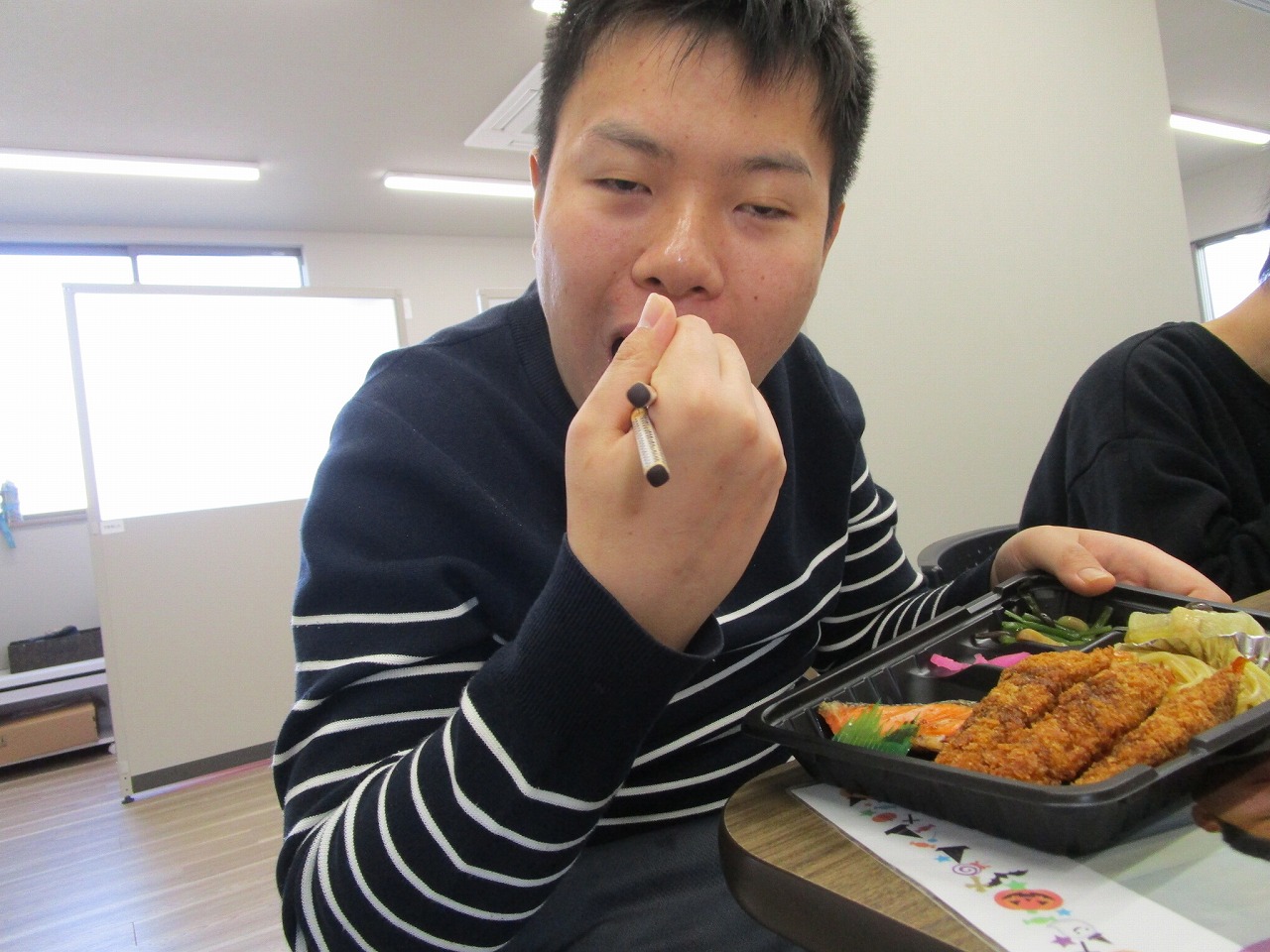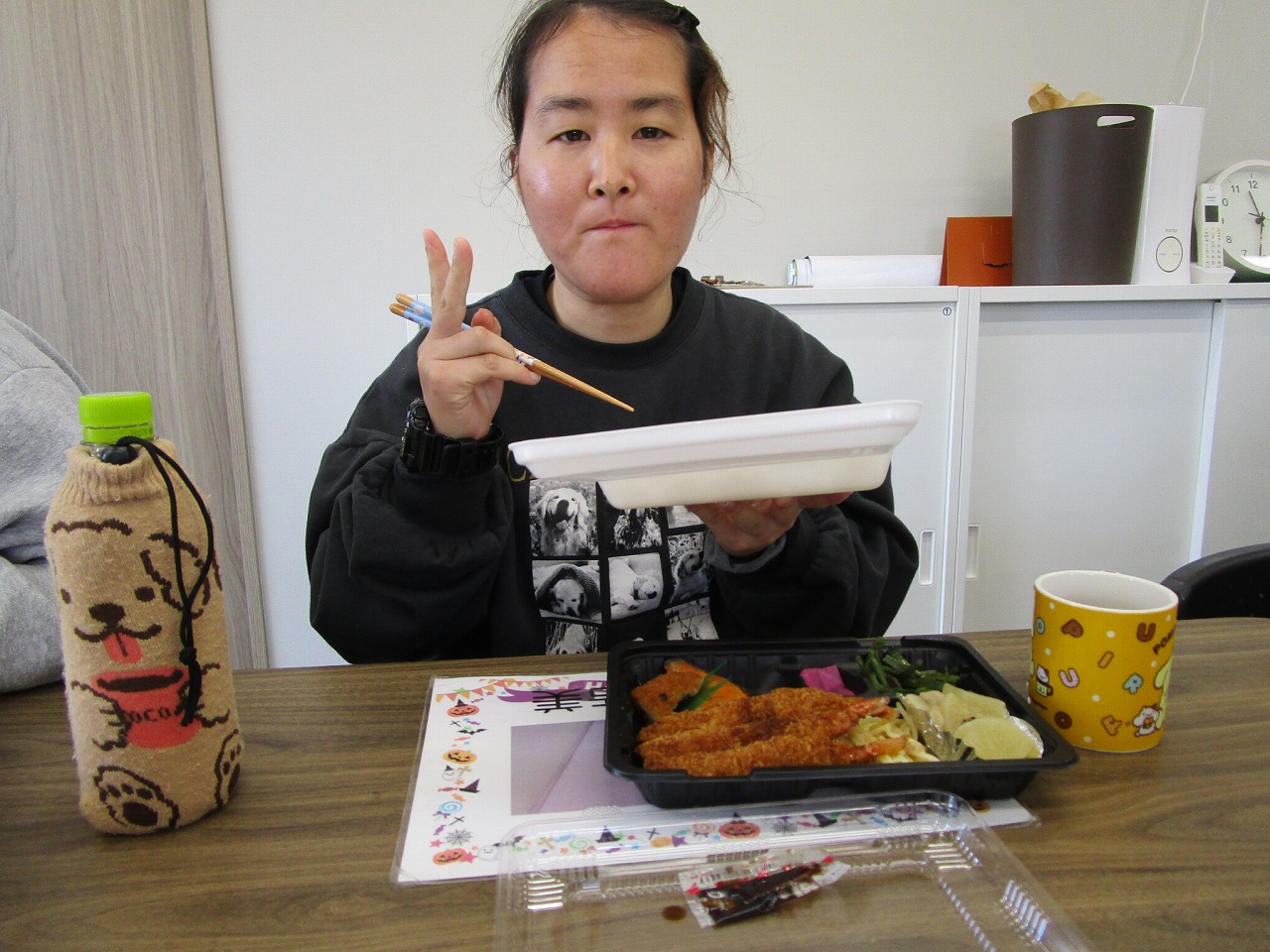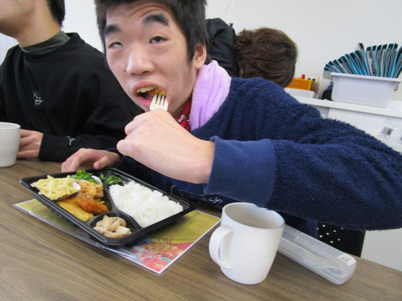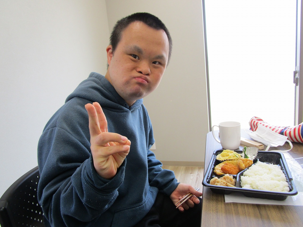 にじいろに戻り、富喜のお弁当「いただきます。」美味しそうに食べてる姿を見てるとこっちまで笑顔になります。
