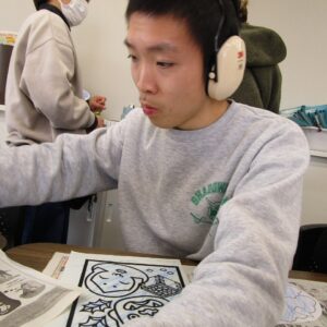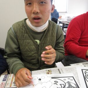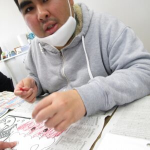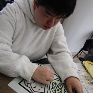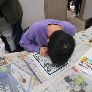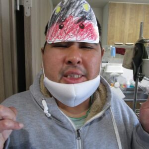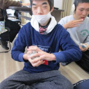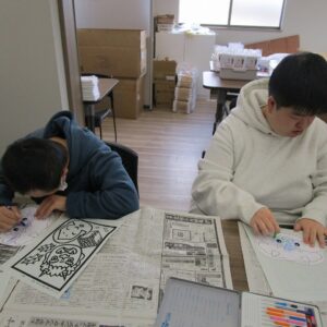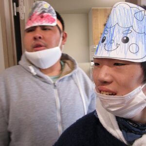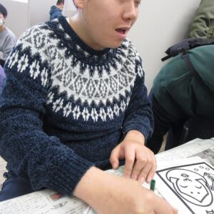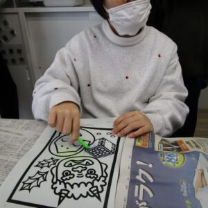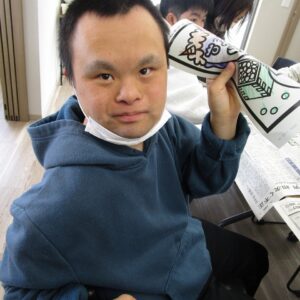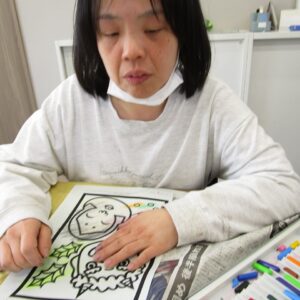 午前中は、塗り絵、お面作り、豆作りをしました。