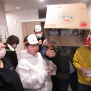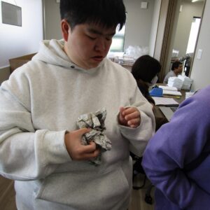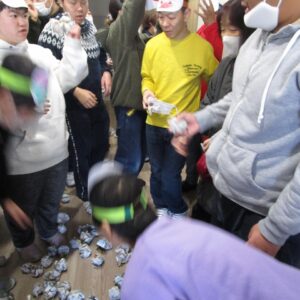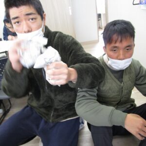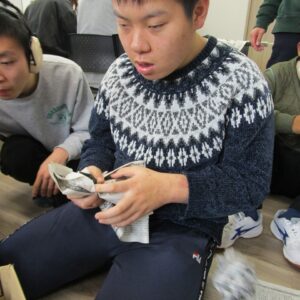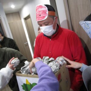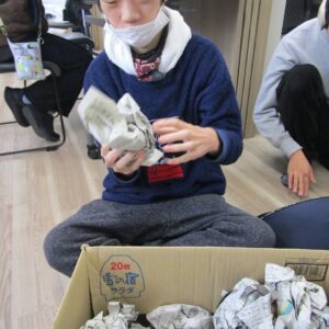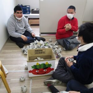 午後から、豆まきを行いました。新聞で丸めた豆を箱に投げ入れます。
