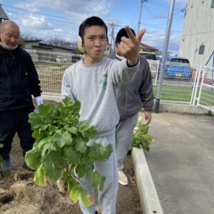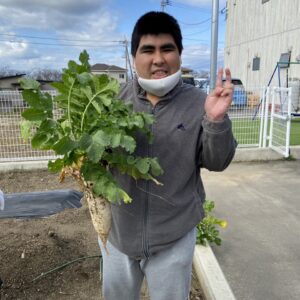 にじいろの畑で育っていた大根を利用者さんと一緒に収穫しました。
