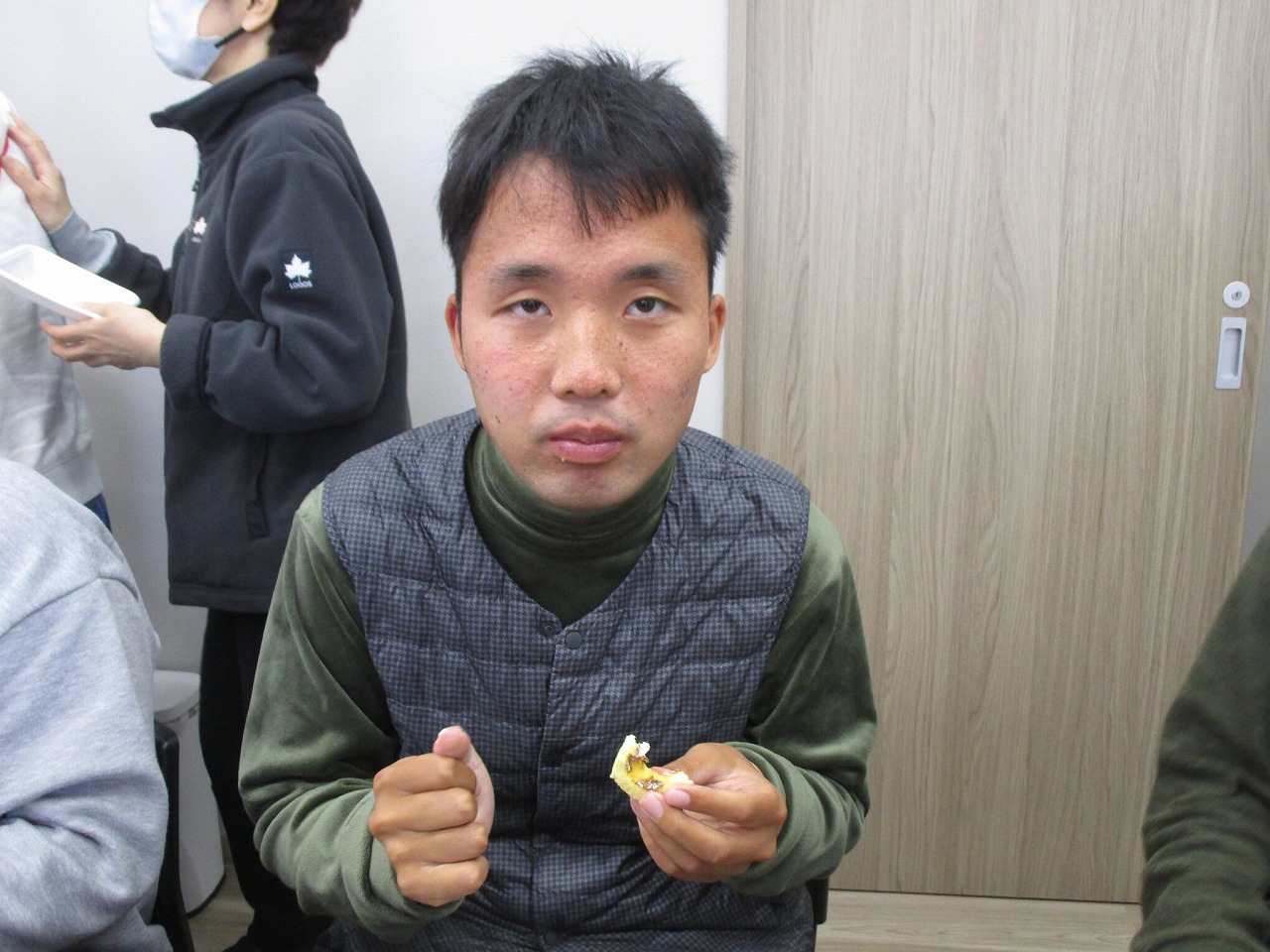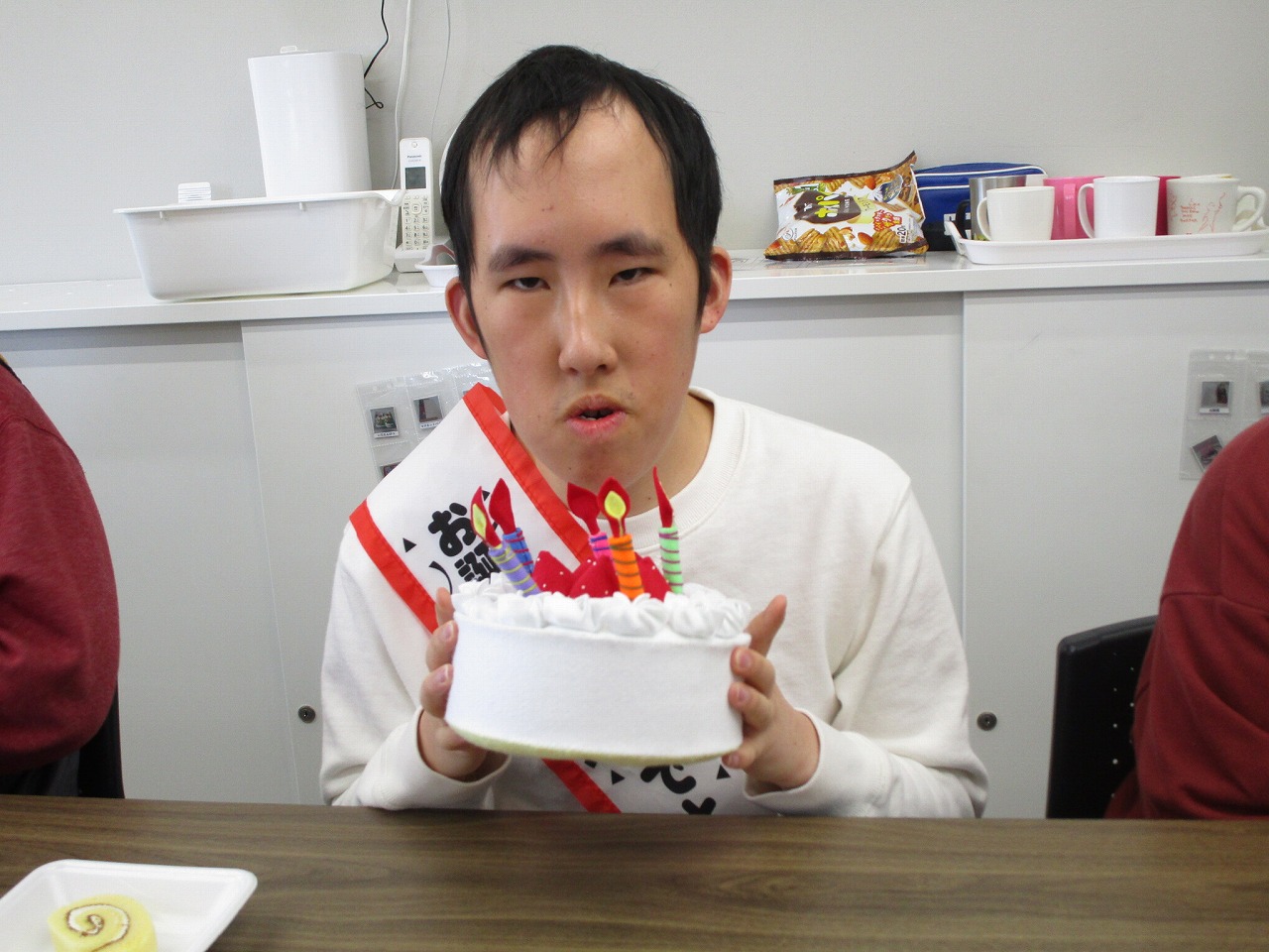 お誕生日会が始まり、みんなでお祝いの「おめでとう!」ロールケーキを食べてお祝いしました。